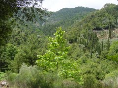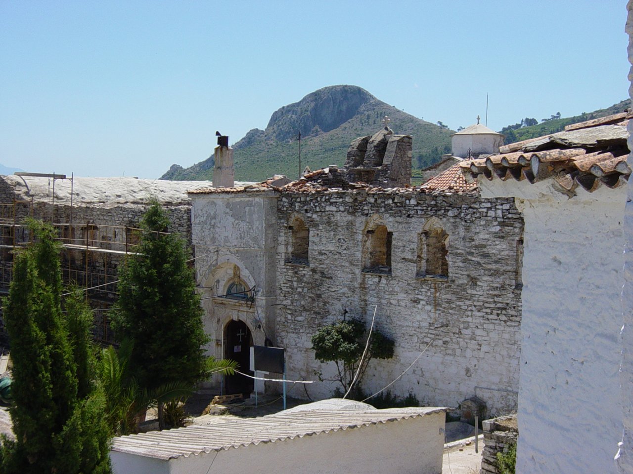 Als we de weg verder volgen komen we bij Vourliotes waar dus die Muscaatdruiven geteeld worden. Als je ongeveer 2 km van het dorp de bergen in gaat kom je bij het Panagia tis Vrontianis klooster. Dit is het oudste klooster van Samos en ligt op 480 meter hoogte. Het is gebouwd in de 16e eeuw. Toen wij er waren, enkele jaren geleden waar ze druk bezig met de restauratie van het klooster. Van hieruit is het 3 uur lopen naar de top van Karvounis berg van 1.153 meter hoog, een van de toppen van het Ampelosgebergte.