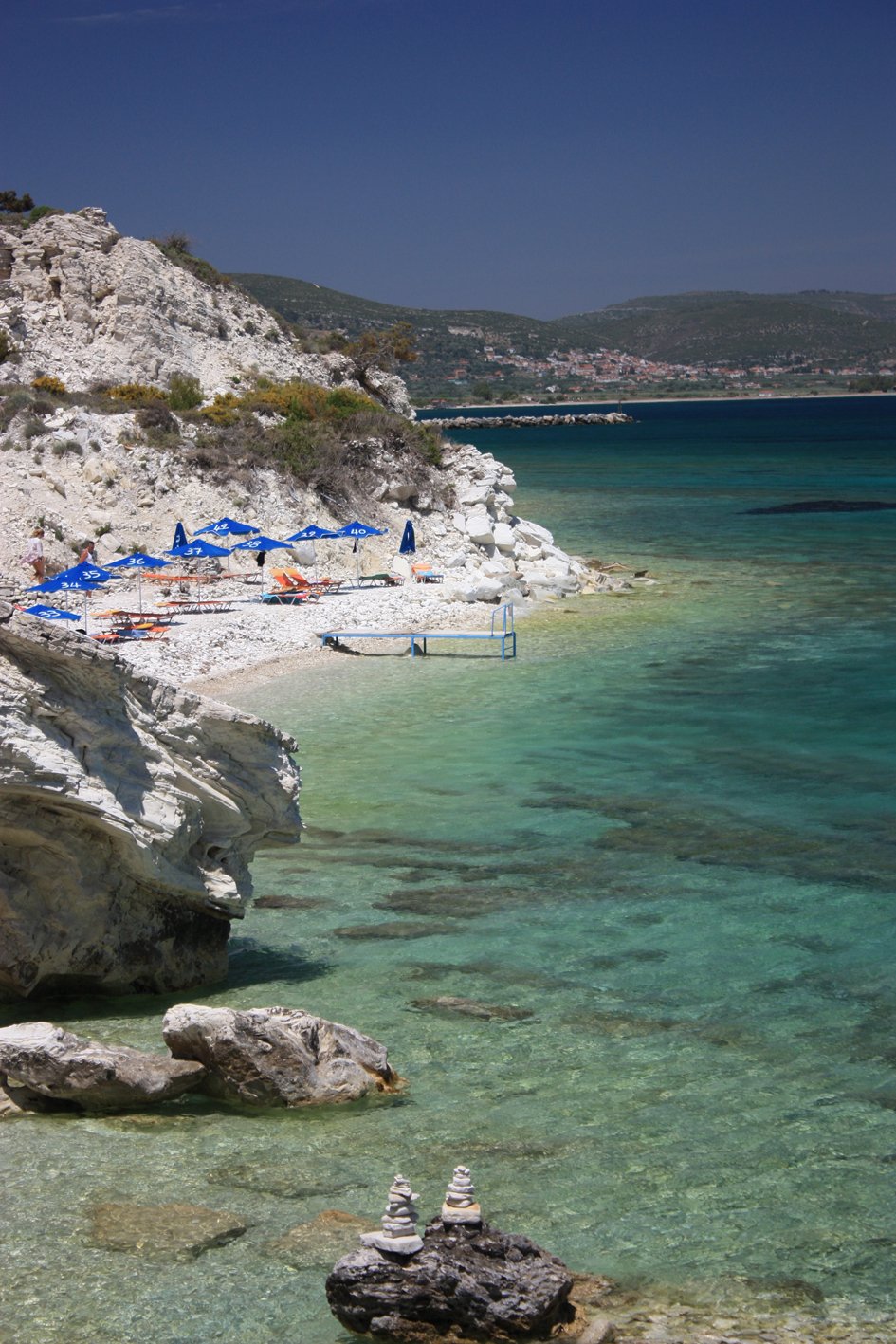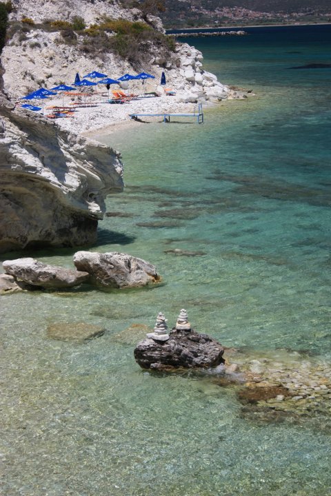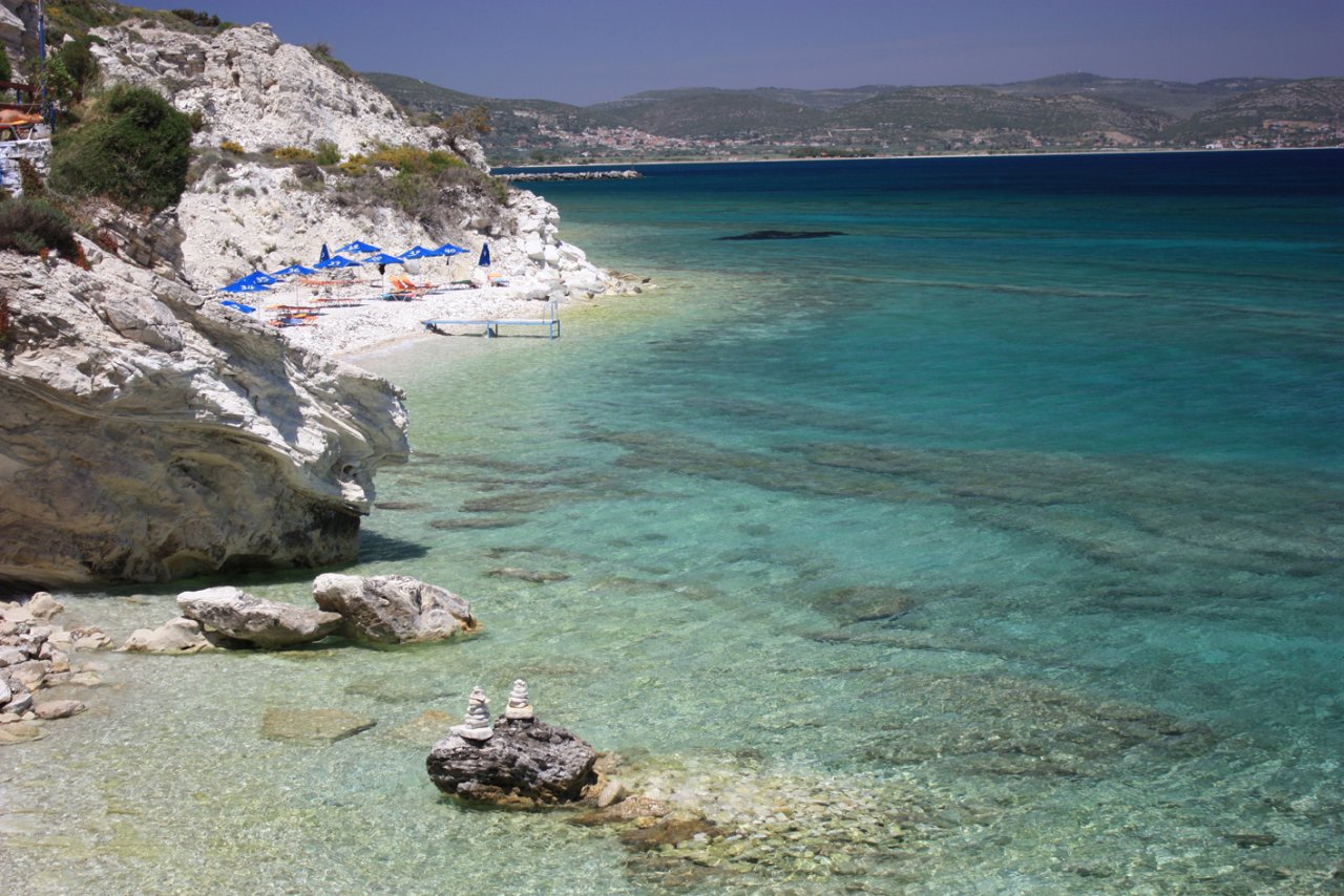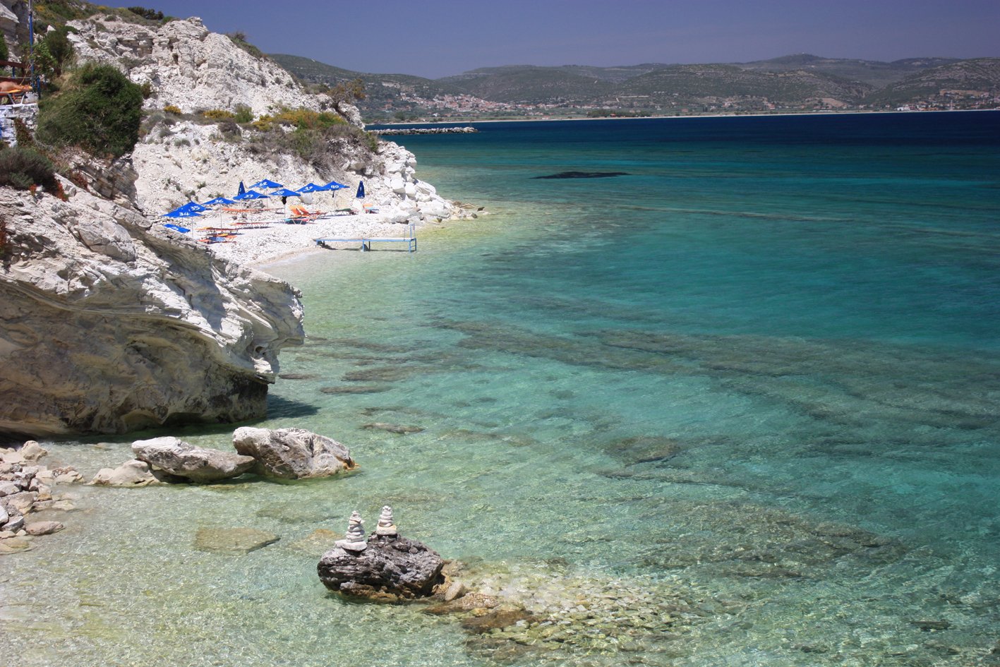 Pappa Beach ligt op een kleine kilometer van Ireon en is te bereiken via een onverharde weg. Het is te doen met de auto maar je moet wel voorzichtig zijn door kuilen en losse stenen. Het strandje ligt in een baaitje van witte rotsen en witte pebbels waardoor de zee een prachtige groenblauwe kleur heeft. De zee is hier ook niet diep en loopt geleidelijke af, een ideale plek om te zwemmen. je kunt hier ook ligbedden met een parasol huren. Bij Pappa Beach is ook een taverne die gerund wordt door Maria, de eigenaresse. Je hebt er doordat deze wat hoger gelegen is een mooi uitzicht op zee en het strand en in de verte kun je Pythagorion zien liggen aan de andere kant van de grote baai. Het is hier heerlijk toeven. Het adres kun je vinden op de contact-pagina.