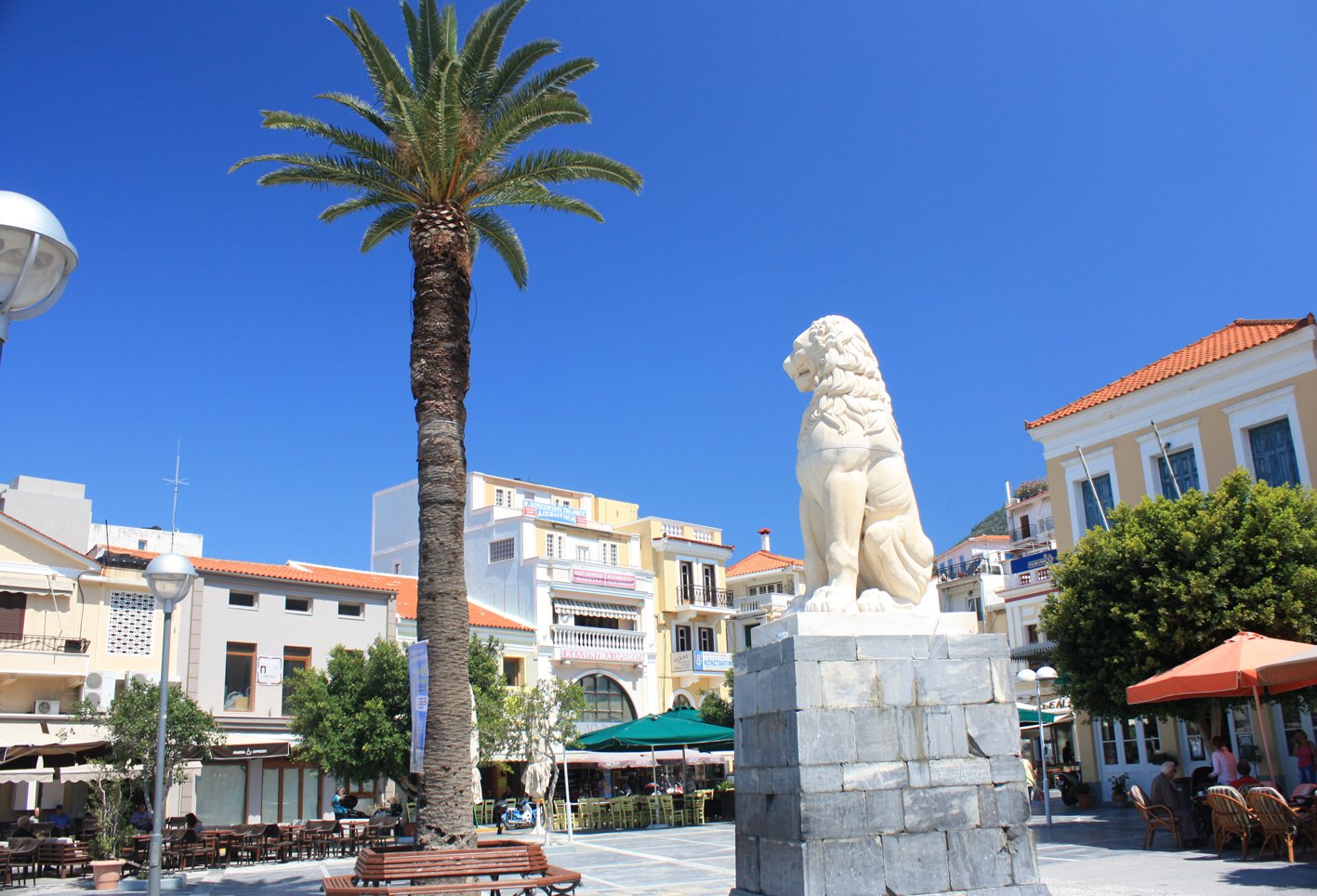 Op het plein staat een beeld van een leeuw. Dit beeld is het symbool van opoffering en moed van de Samioten tijdens de Griekse onafhankelijkheidsoorlog tegen de Turken. Het beeld werd geflankeerd door 4 grote palmen. helaas zijn er daar een paar van geveld door een parasiet.